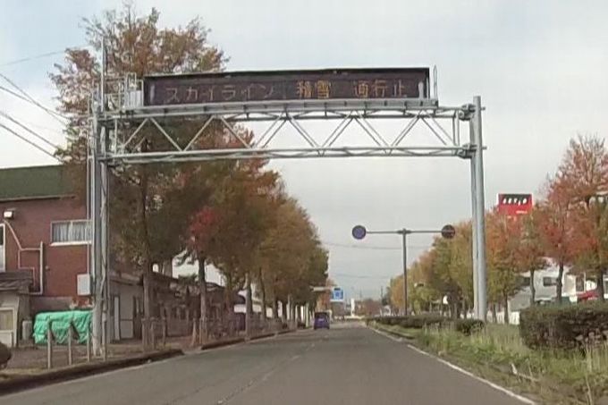 | 次は磐梯吾妻スカイラインを福島西ICから目指します。 | 福島西ICを降りて磐梯吾妻スカイラインに向けて走っていると、ショッキングな掲示が! 雪!?Σ(・□・;) |