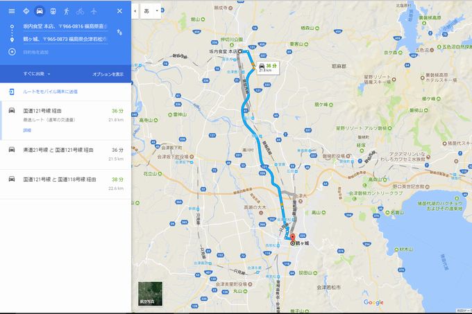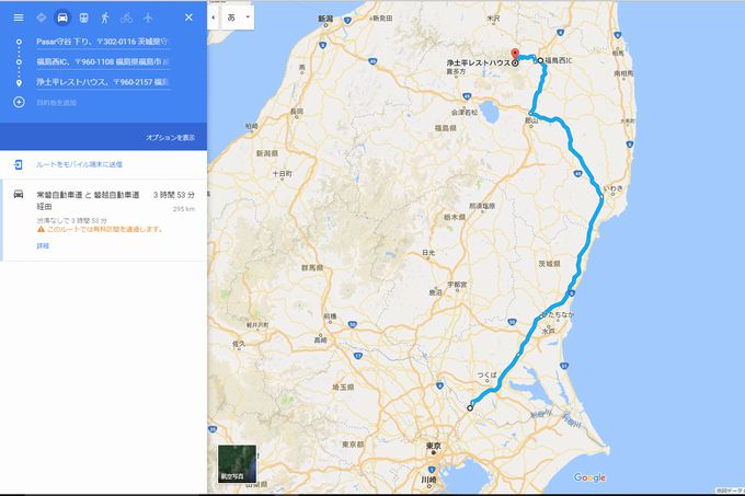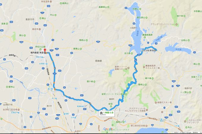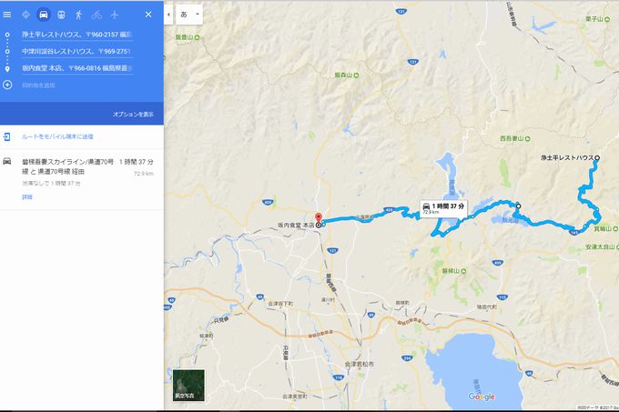 | 守谷から福島西ICまで高速で。 途中適宜にPAにて休憩。 浄土平レストハウス 所在地:〒960-2157 福島県福島市土湯温泉町鷲倉山浄土平 地内 пF0242-64-2100 | 坂内食堂 所在地:〒966-0816 福島県喜多方市細田7230 電話:0241-22-0351 経由地:中津川渓谷レストハウス 所在地:〒969-2751 福島県耶麻郡猪苗代町若宮2998-47 電話:0242-64-2817 |