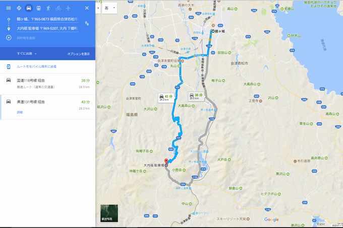 | 鶴ヶ城 所在地:〒965-0873 福島県会津若松市追手町1-1 電話:0242-27-4005 | 大内宿 所在地:〒969-5207 福島県南会津郡下郷町大内山本8 電話:0241-68-2657 県道131号経由 |