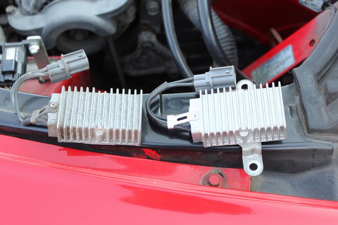 | で、装着後の写真 こんな感じで収まりました ちなみに右のユニットは、トラクションコントロールユニット 私はこの配線を抜いて、常時トラクションコントロールは解除してあります 初期型のはあまり賢くないので、 インチアップした時点で使う気は無しですから、 休眠してもらいました |