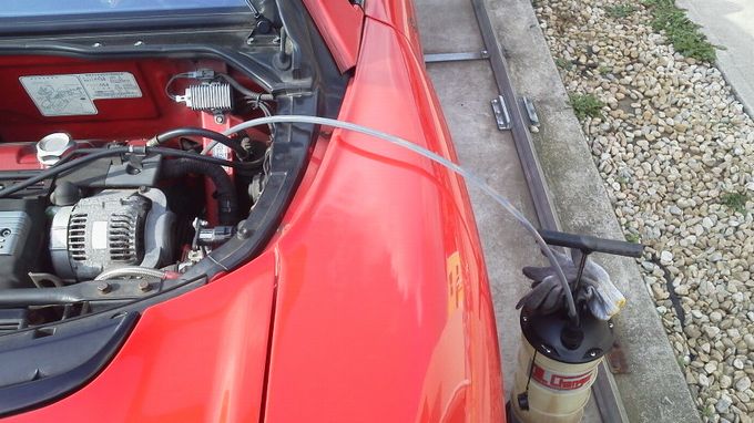 | 15分程アイドリングしてフラッシングも終了したので、 乾燥中に古いエンジンオイルを抜き取り・・・ |