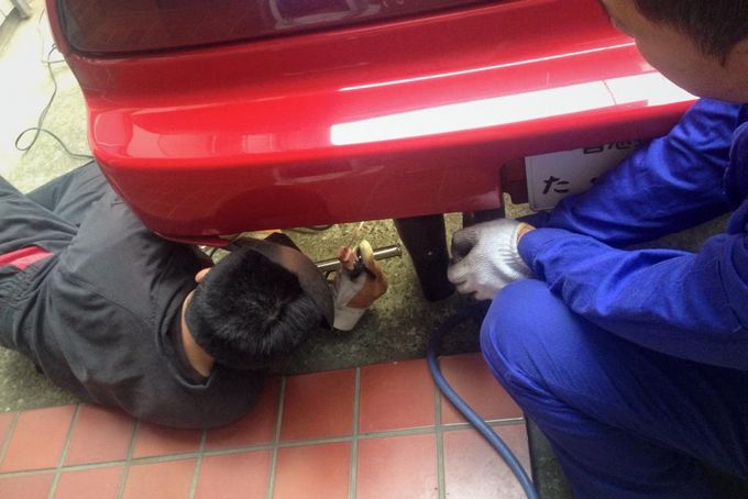 見事な溶接技術で、しっかりマフラーステーが溶接されました。