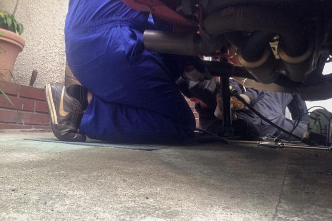 マフラーを外そうとしたところ、ナットの固着が凄いのでそのまま作業をすることに…