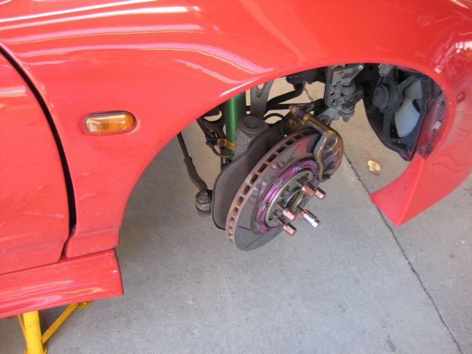 | ジャッキアップしたら、ハンドルを切って作業しやすくします |