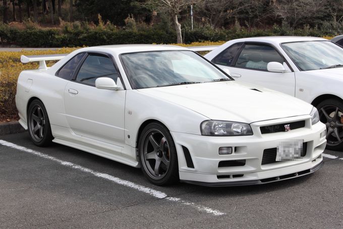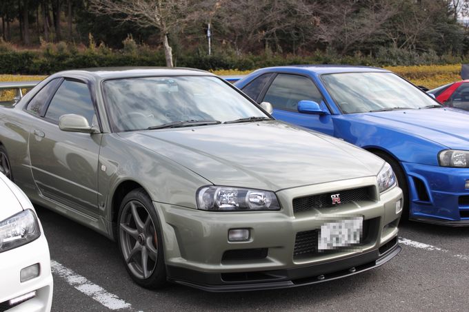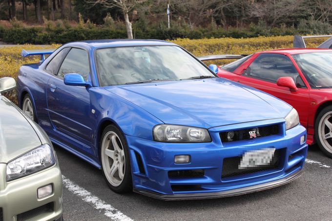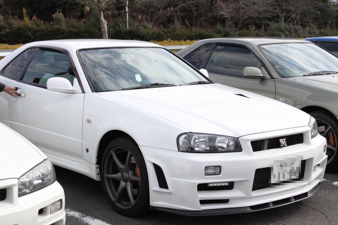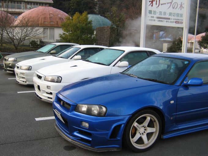 隊列を組んで向かいます! 合計9台 内 R34GT-Rが4台という凄い豪華さ☆ 通り過ぎる皆さん笑顔になります(´ω`*) | まずは到着したら記念撮影☆ カーソルを合わせると・・・ |