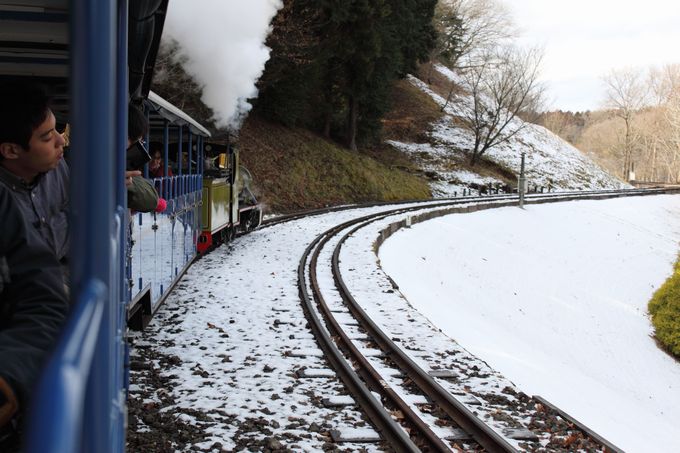 園内はイギリス調で、可愛いSLが走っています 乗り物好きのメンバーなので、しっかり乗車します |