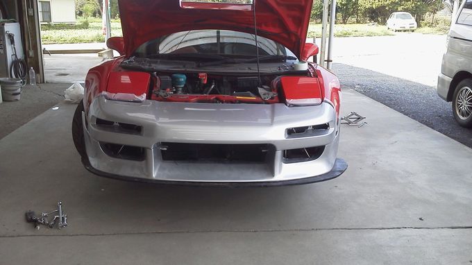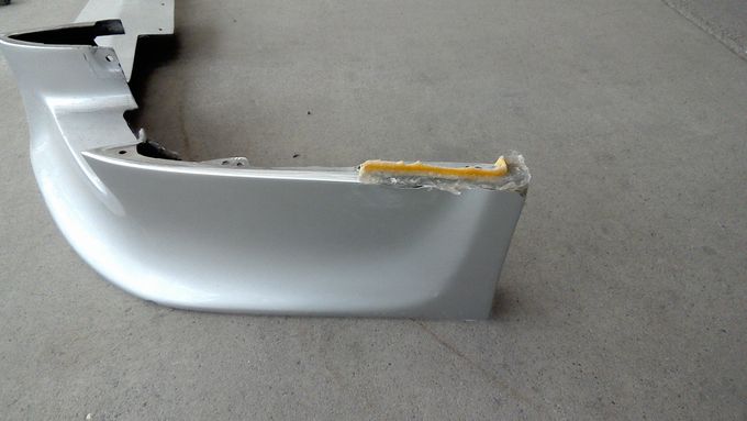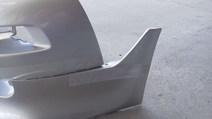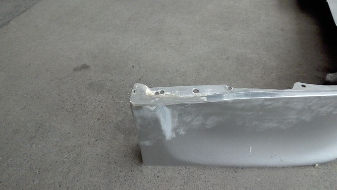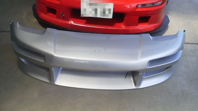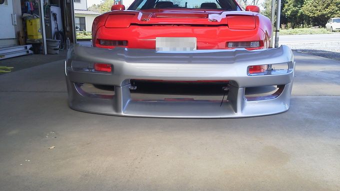 | 次期主力バンパーは2ピースで、上が純正、下が社外品の組合せ。 中古品で届いたとき、タイラップ止めで不思議だったけど、ボルトで止めようとしたら穴が合わない! なるほど、そういうことかと思いながら、長穴加工したりしていたら、意外に時間を費やしました。 次期バンパーはフェンダー部分にエラがあり、これが干渉していたので、ひとまずぶった切ってフェンダーに干渉しないようにしました。 | |