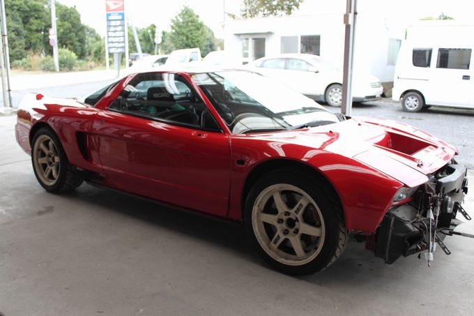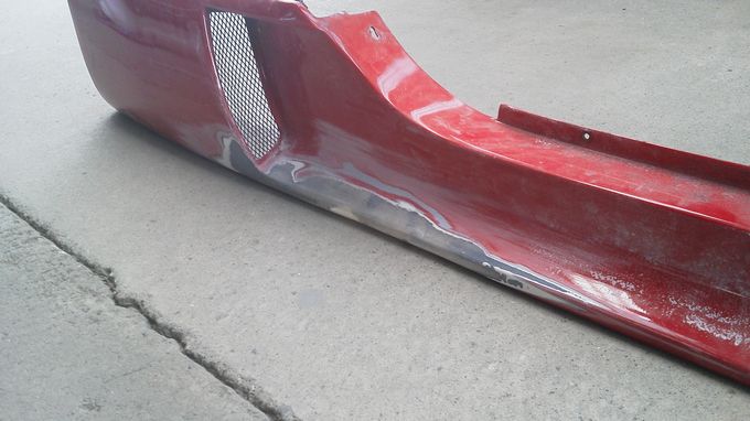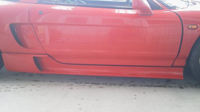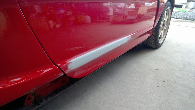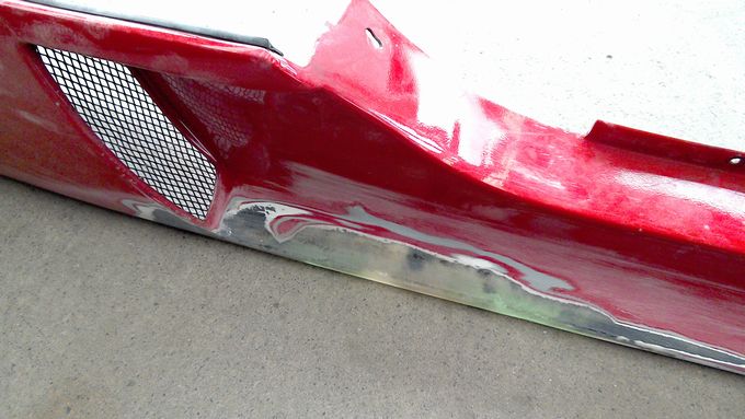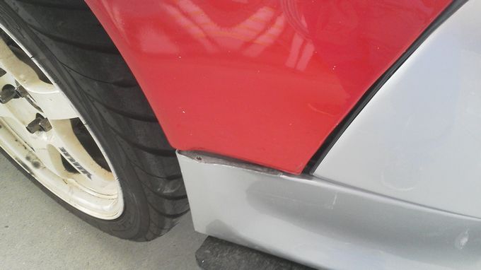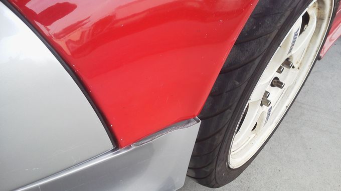 | バンパーは顎を擦ってガビガビ、サイドステップもガビガビになり、 右サイドミラーと右ドアのクリア塗装が剥げ剥げに、 右リアワンオフフェンダーにクラックが入ったりと満身創痍の状態 |