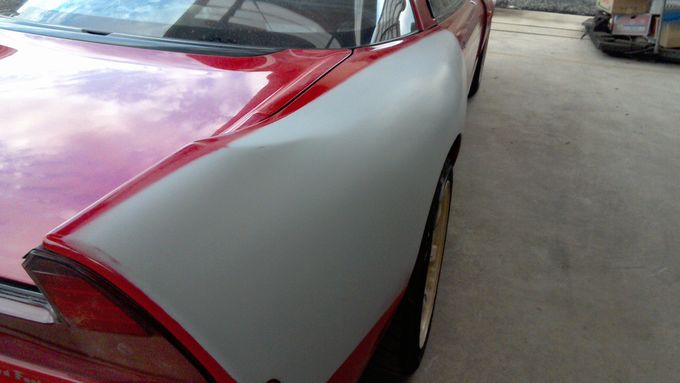 | サフェーサー散布はプロの友人がやってくれたので、サフェーサー研ぎは自分でやりました 今回は、リアフェンダーと右ドア、トランクの研ぎを行っています ※前後比較が無いのが失敗ですね(;^ω^) |