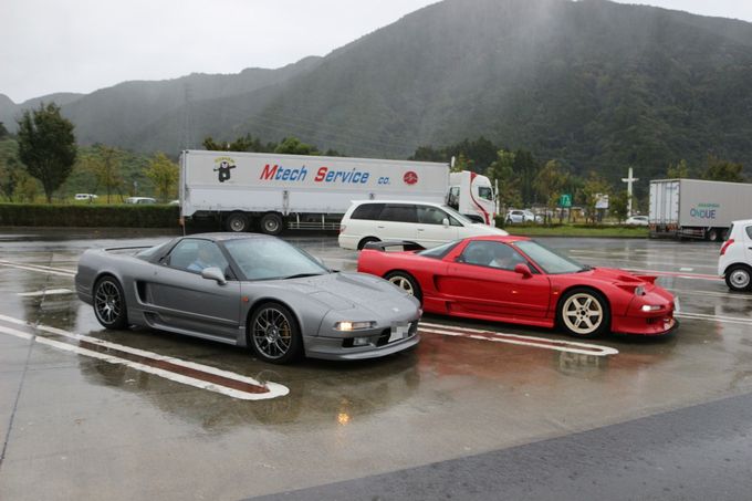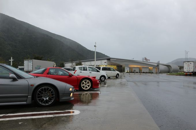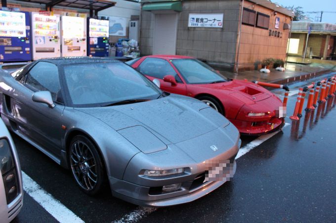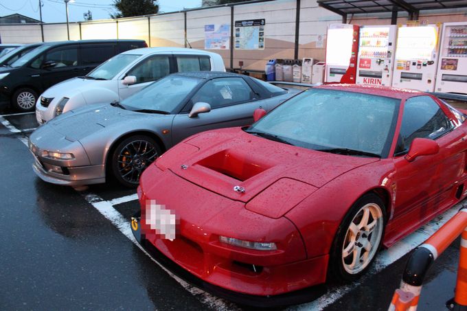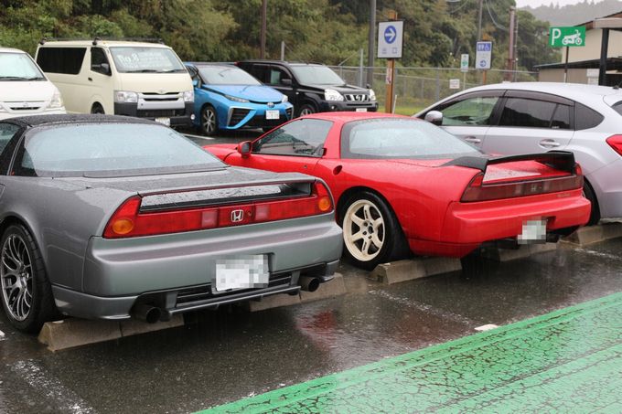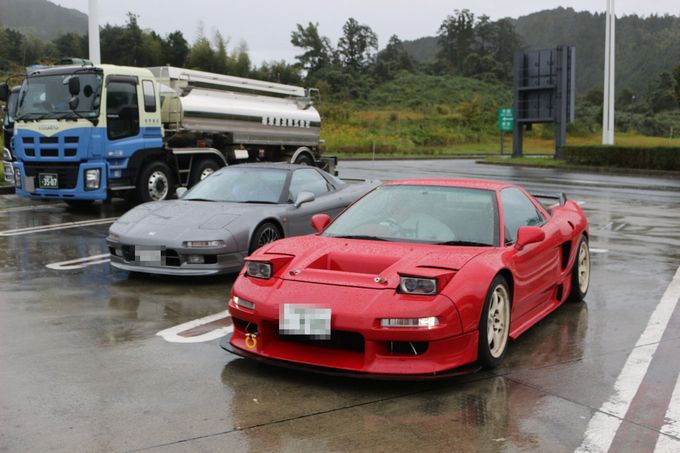 | 予定通り3時間で箱根峠に到着し、少し減衰ダイヤル前後一ノッチずつ柔らかい方向へ。 台風の影響で路面状況がヘビーウェットが予想されるため、空気圧を前後2.8キロと高めに設定。 そしてそのまま走ると、車体が跳ね過ぎるので、減衰ダイヤルで調整することにしました。 箱根峠を下りだすと、この設定はあたり! とても走りやすいです。 | 箱根峠から富士までは50分ほどで到着。 | 早めに到着したので仮眠をとり、ここでwako-d2と合流! | wako-d2のNSXはお父様と共同購入。 今回はお父様も一緒に参加です(^◇^) | さぁ、ここから2台でランデブーして行きます 次の休憩地は2時間ほど走行して、道の駅「潮見坂」に到着 |