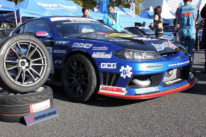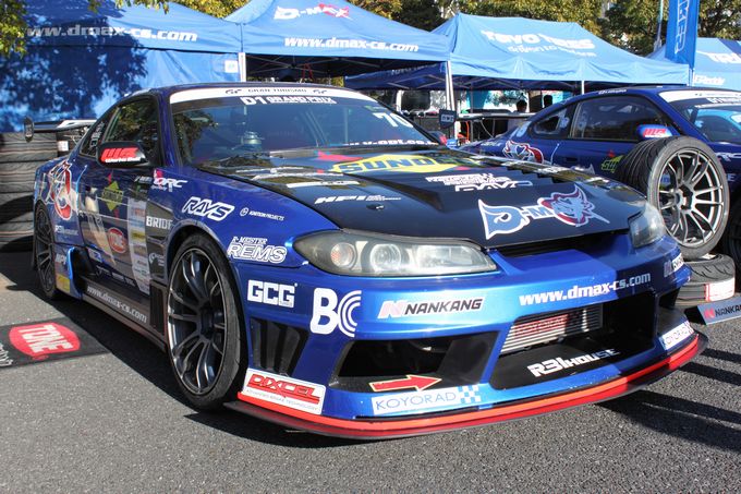 | 屋外会場にあった気になる車両。 D1マシンのS15ですが、一台はシャコタンで、もう一台は車高が高くストロークが確保されています。 ドリフトもストローク重視になっていているのかな?(;・∀・) |