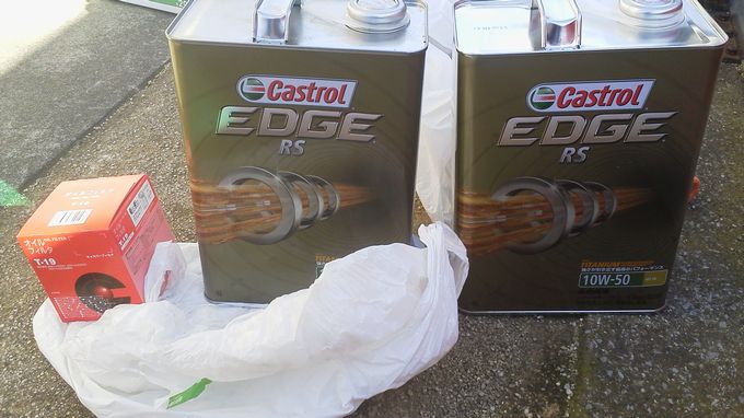 | 今回のオイルはカストロールのRSです。 ホームセンターで安売りしていたので、2,980円でゲット! 粘度は10w-50と固めですが、やっぱり回した時の安心感はありますねぇ。 |