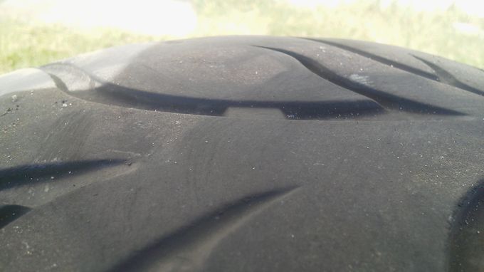 | せっかく外したので各部の点検も行い、リアタイヤの状況確認。 分かりにくいけど、スリップサインまで2oくらい。 また近いうちにタイヤを交換しないといけないな。 |