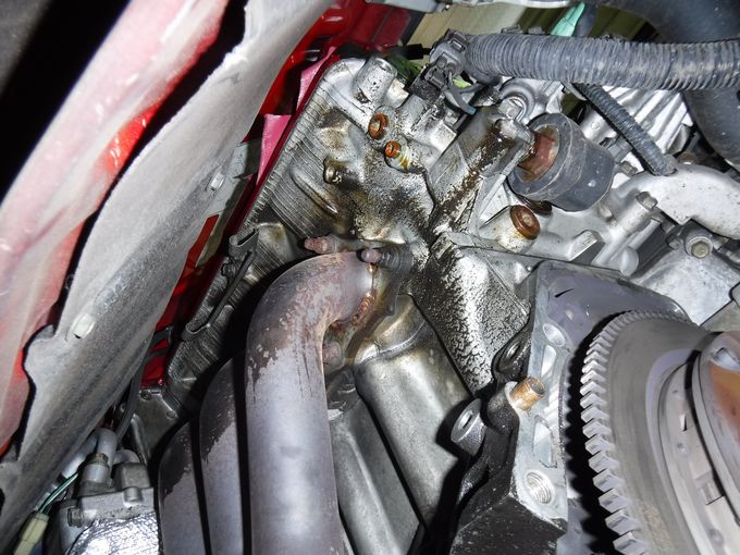 | リフトアップついでで、目視点検。 フロントバンク側のヘッドからオイル滲み… | リアバンクもヘッドからオイル滲み… 前回ヘッドのパッキンを交換してから、10年以上8万キロも走ればそうなるか… |
