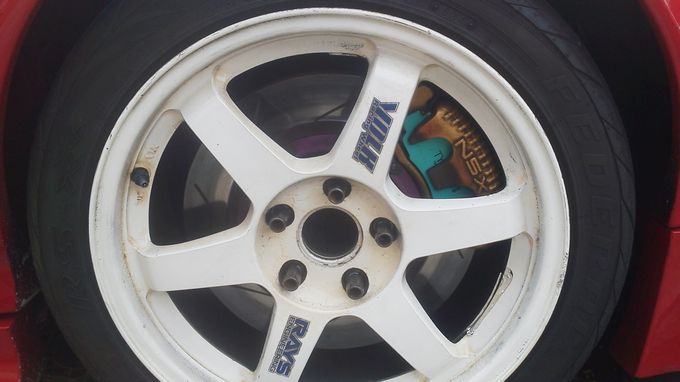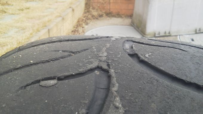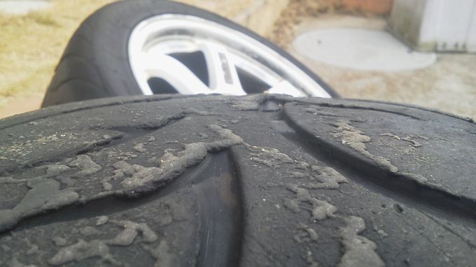 | まずはジャッキアップ! | タイヤを外したついでに、残量チェック! リアタイヤですが、ほぼスリップサインですね。 左右は綺麗に減ってくれています。 |