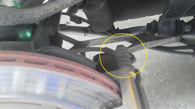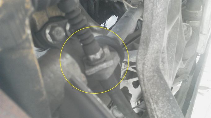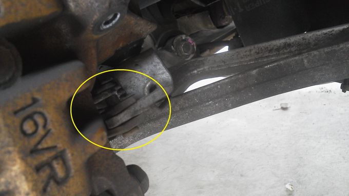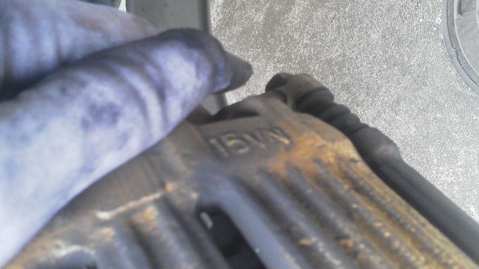 | フロントタイヤも同じくスリップサインまで、2〜3ミリ程度でしょうか。 左右は綺麗に減ってくれているので、アライメントデータ的には私の走り方に合っていそうです。 | 今回はリアパッドから交換します。 まずはサイドブレーキのワイヤーを止めているピン外して、切り離します。 |