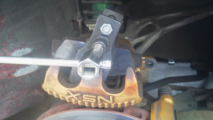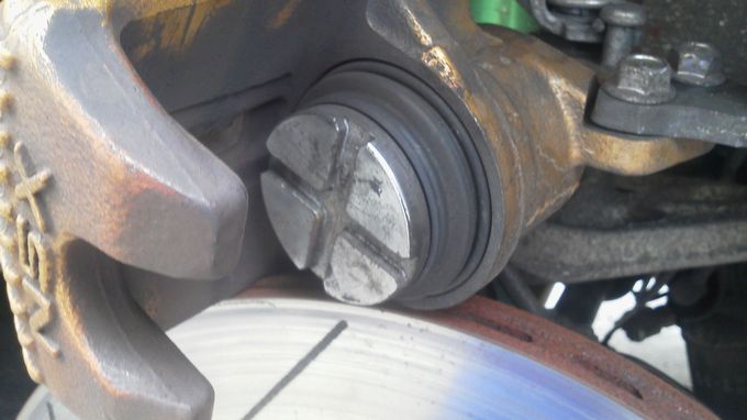 | リアキャリパーが外れました | リアキャリパーのピストンはサイドブレーキと一体なので、 ピストンを戻すには時計回しでねじ込んでいきます。 |