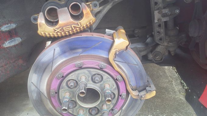 | 続いてフロント側。 キャリパーのボルトを外すだけで、交換できます。 | こんな感じで、分離しました。 |